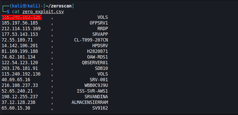 python convert-nmap-zerologon.py /home/kali/zero_logon.xml | grep "yes" | awk -F "|" '{print $1"," $4}' > zero_exploit.csv