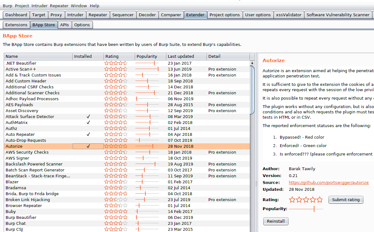 Bạn có thể cài đặt Autorize từ BApp Store trong Burp.