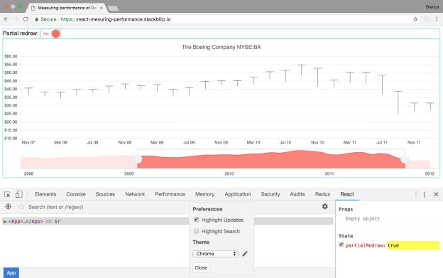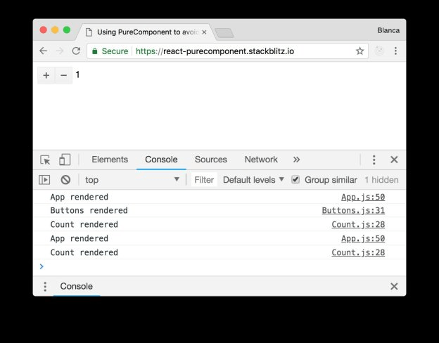 Bây giờ, mỗi khi một thành phần được re-render, chúng ta sẽ thấy một đường viền màu xung quanh nó. Render một thành phần và chạy đồng nhất thay đổi thường rất nhanh, nhưng không phải là không hao tốn gì đó. Nếu chúng ta muốn làm cho ứng dụng của mình hoạt động tốt, chúng ta sẽ cần tránh việc re-render và đồng nhất không cần thiết. Một cách để tránh re-render không cần thiết trong một thành phần là cho nó kế thừa từ React.PureComponent thay vì React.Component. PureComponent thực hiện so sánh bề nổi về các props và state hiện tại và tiếp theo, và tránh re-render nếu tất cả đều giống nhau.