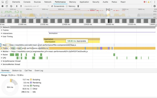 Thời gian khởi tạo và cập nhật luôn thấp hơn trong chế độ production. Đó là lý do tại sao việc build bản production cho người dùng là rất quan trọng!