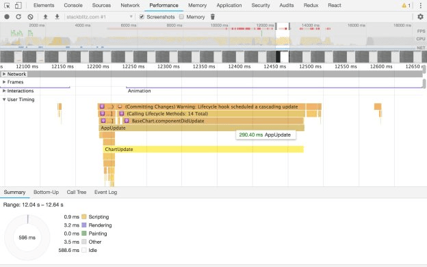 Đó là một sự khác biệt đáng kể! Lý do thứ hai là các bản build production chứa ít code hơn để chạy. Những thứ như warnings và thông tin hồ sơ được xóa khỏi các bản build này, vì vậy React sẽ nhanh hơn. Đây là một ví dụ chạy React trong chế độ development, với một component được khởi tạo và cập nhật: