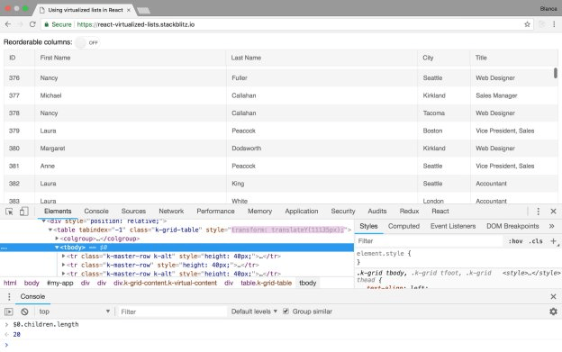 Lưu ý rằng DOM cho rằng chỉ có hiển thị 20 nút "tr" bên trong tbody đó, mặc dù bảng này chứa tới 50.000 phần tử. Hãy tưởng tượng bạn đang cố gắng hiển thị toàn bộ 50.000 phần tử trên một thiết bị cũ và dự đoán xem sẽ mất bao lâu để nó hiển thị hoàn toàn!