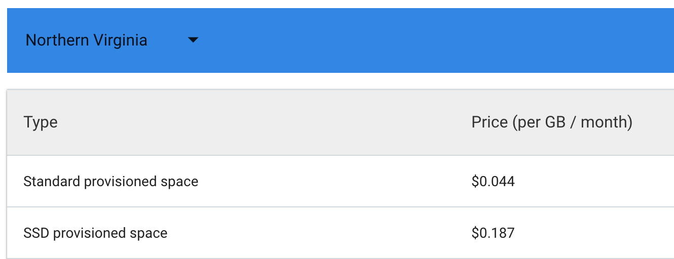 Ví dụ dưới đây là giá của Persistent disks (Standard and SSD) ở vùng Northern Virginia: