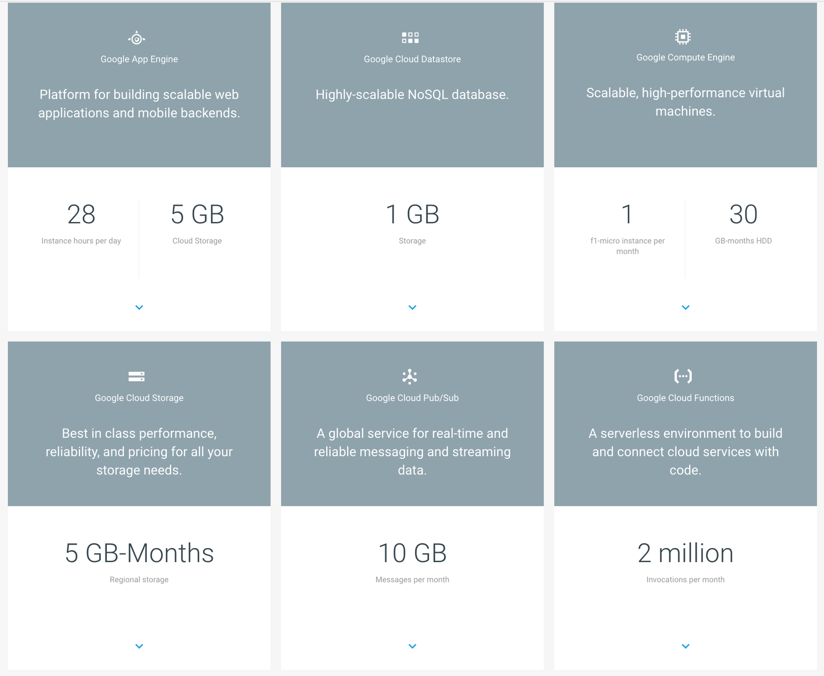 Screenshot phía trên chỉ là một góc của những serivce mà Free Tiers cho phép bạn sử dụng cùng với ghi chú về mức độ sử dụng của nó. Ví dụ: Với Google Compute Engine bạn sẽ được dùng free một em có mã hiệu f1-micro instance - nghe micro là thấy tí xí rồi :v