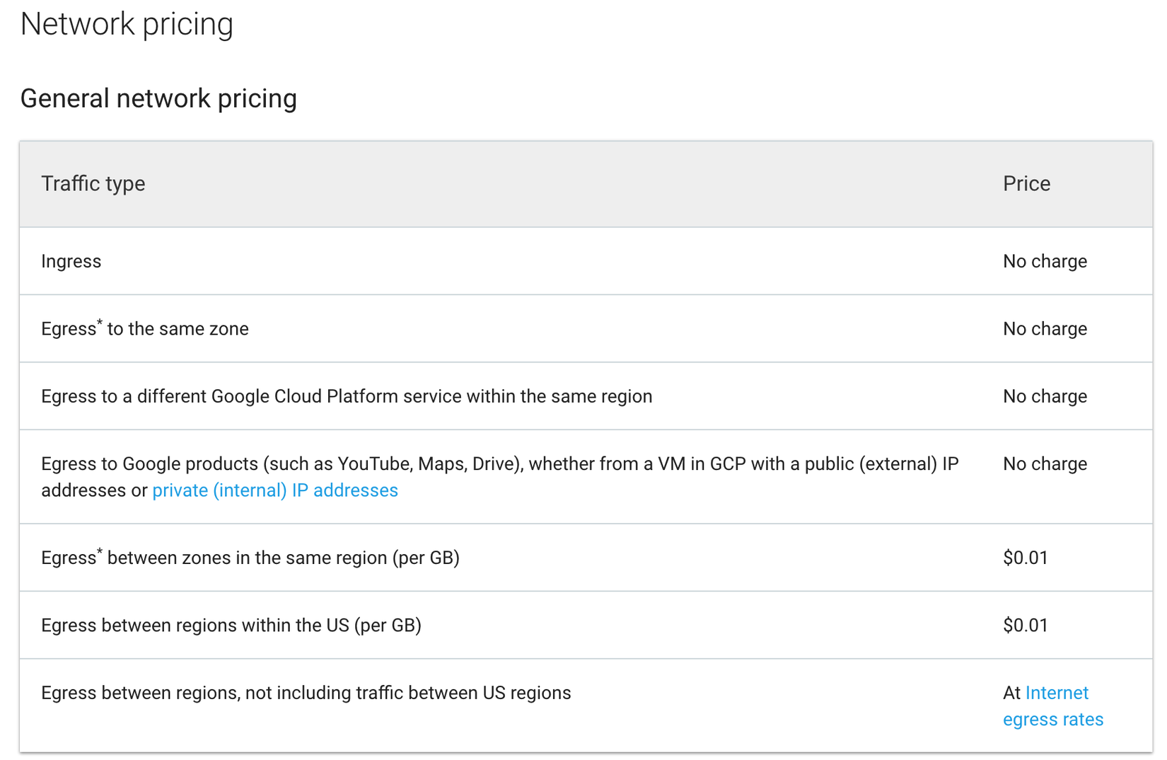 GCP không tính tiền với Ingress (luồng đi vào) nhưng sẽ thu phí đối với Egress (luồng đi ra). Nhưng điều này cũng còn phụ thuộc vào việc các service trong system của bạn nằm trên cùng hay khác region (vùng) , cùng hay khác zone, có cùng trên GCP...