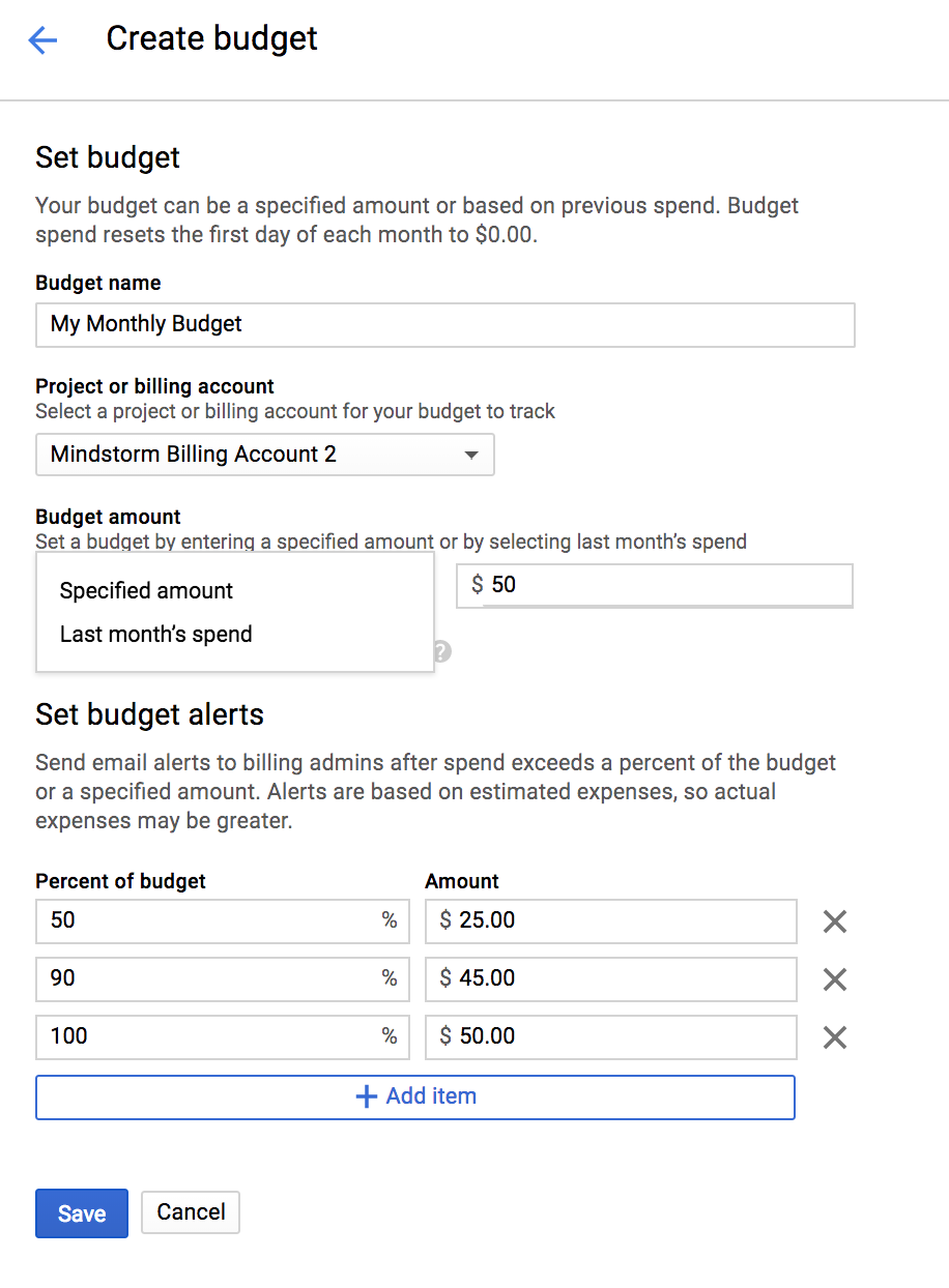 Dưới đây là một ví dụ, để ý thấy bạn có thể set Budget đến hạn mức là một con số cụ thể hay là mức mà bạn đã sử dụng vào tháng trước.