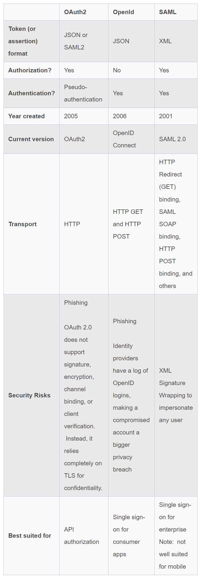 Dưới đây là so sánh giữa OAuth2 với OpenID VÀ SAML