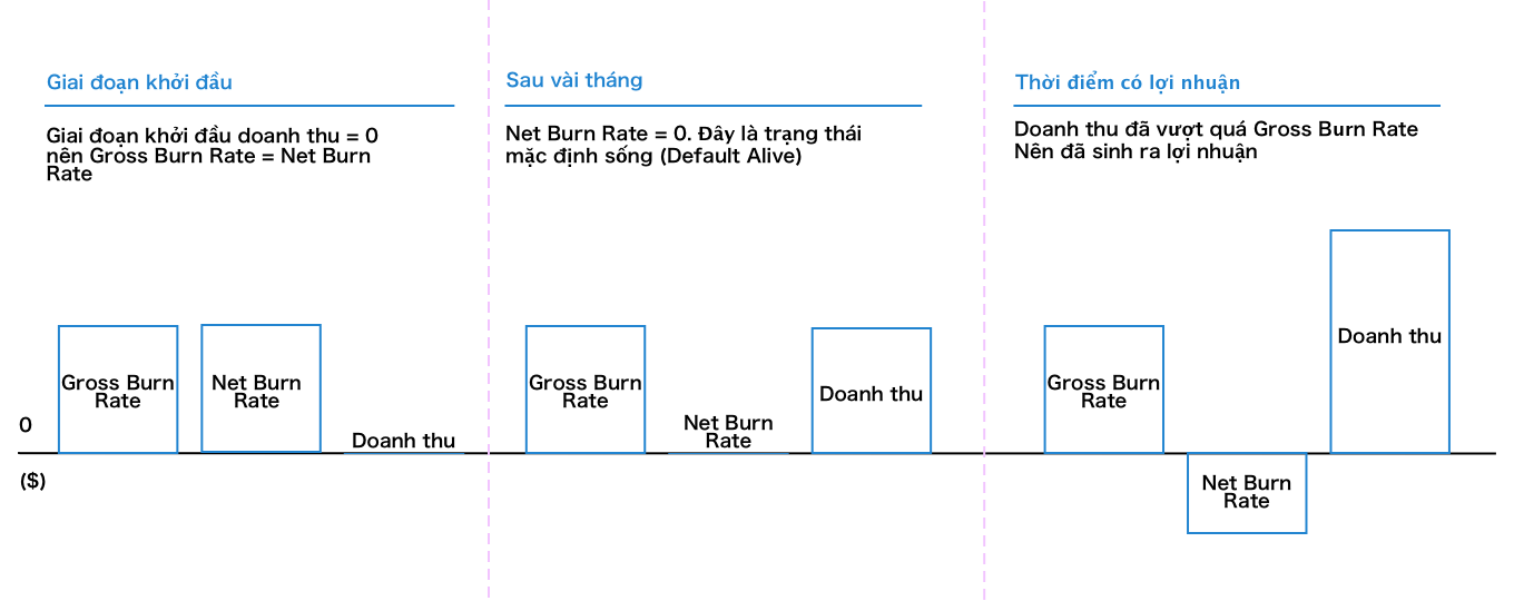 Giai đoạn tiếp theo sau khi bắt đầu có doanh thu thì lúc này Burn Rate dần dần tiến đến 0. Và khi có lợi nhuận thì Burn Rate < 0