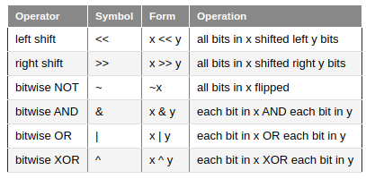 Toán tử bitwise NOT (~) có lẽ là dễ hiểu nhất trong tất cả các toán tử bitwise. Nó chỉ đơn giản là lật từng bit từ 0 thành bit 1 hoặc ngược lại. Lưu ý rằng kết quả của NOT phụ thuộc vào kích thước loại dữ liệu của bạn. lật 4 bits: ~0100 là 1011