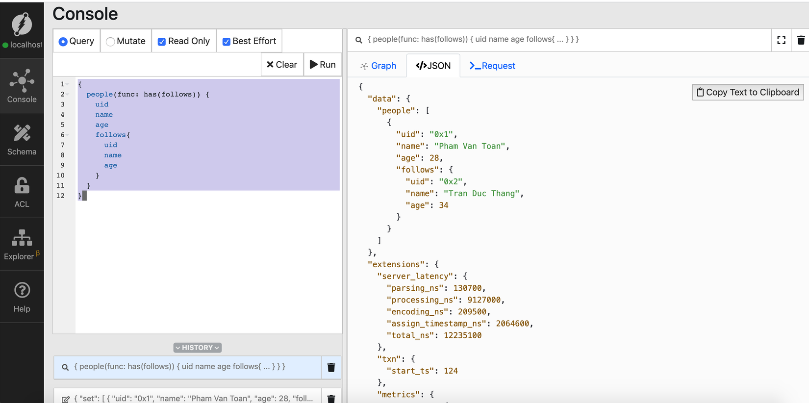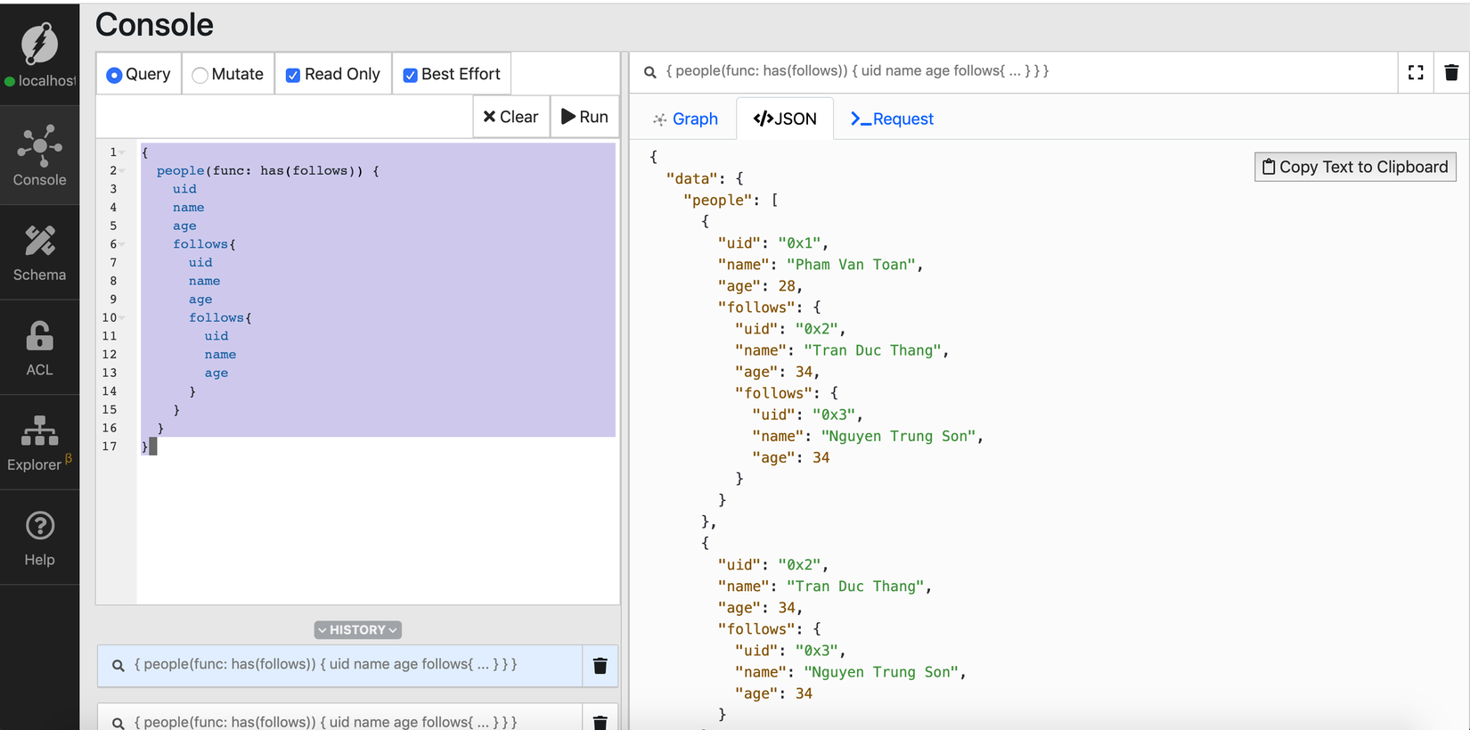Ví dụ này sẽ tạo ra hai user và cho chúng follow lẫn nhau. Khi cần update chúng ta cũng cần phải truyền tương ứng các uid vào. Để query chúng ta sẽ sử dụng