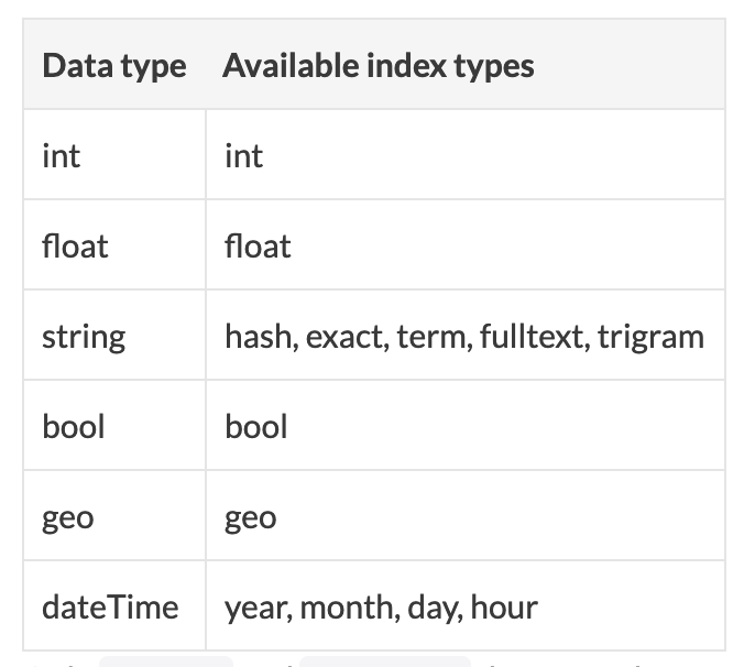 Indexx là kĩ thuật giúp cho việc query trên predicate được thực hiện với tốc độ nhanh hơn và nó là bắt buộc khi muốn query giá trị của một predicate. Dgraph cung cấp các loại index khác nhau cho từng kiểu dữ liệu cụ thể như trong bảng sau