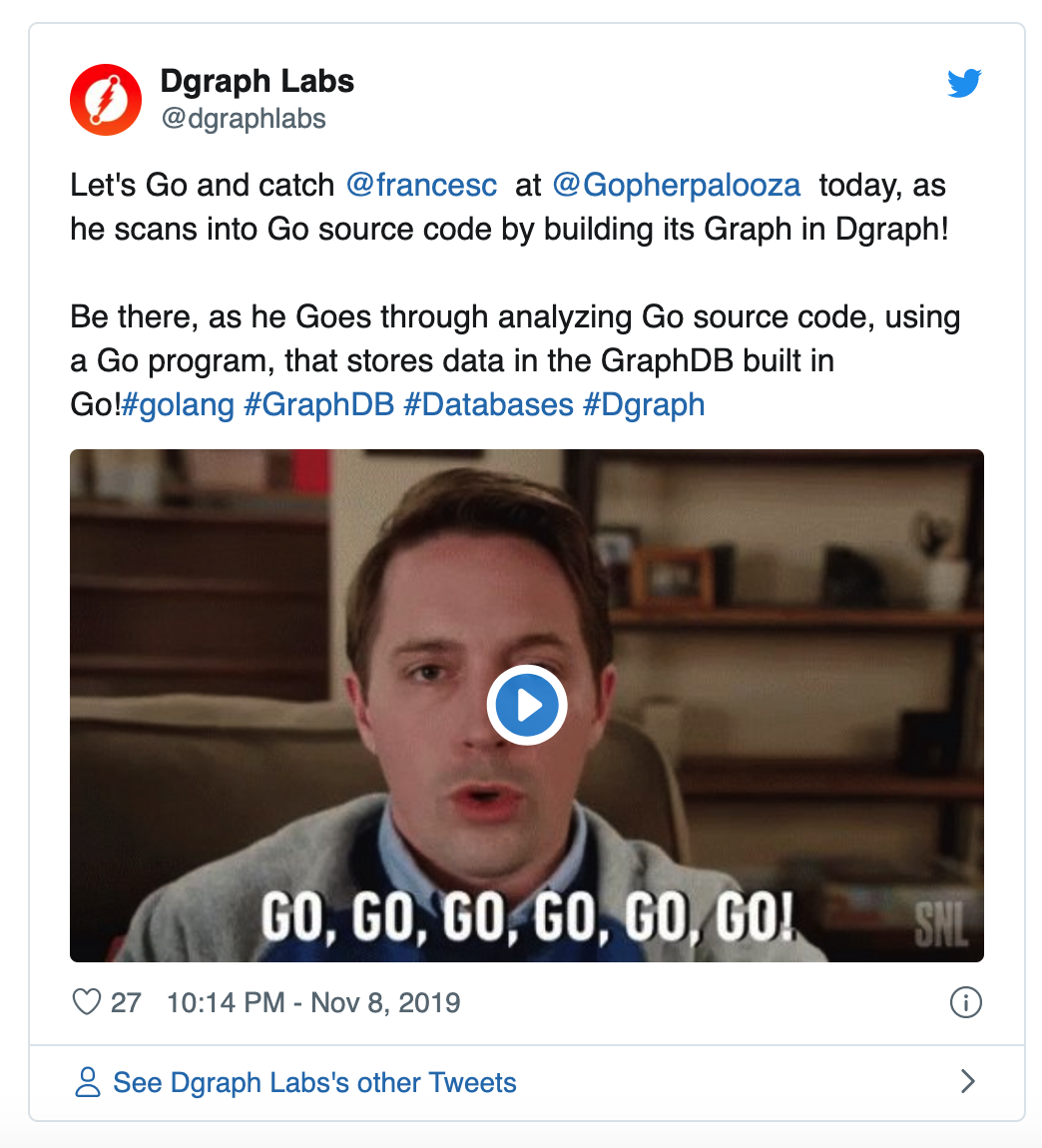 "tweet": "Let's Go and catch @francesc at @Gopherpalooza today, as he scans into Go source code by building its Graph in Dgraph!\nBe there, as he Goes through analyzing Go source code, using a Go program, that stores data in the GraphDB built in Go!\n#golang #GraphDB #Databases #Dgraph ",
