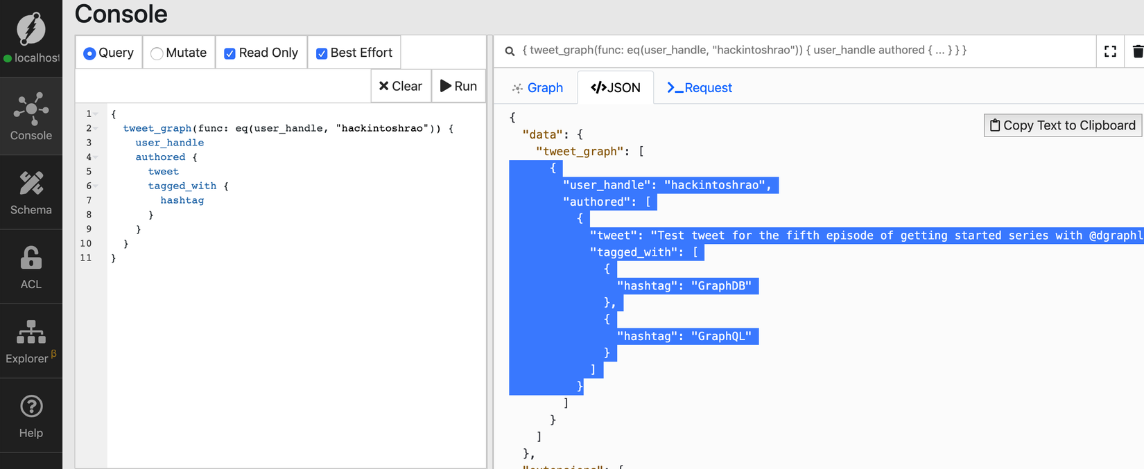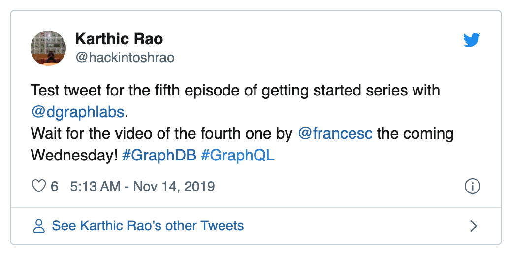 "tweet": "Test tweet for the fifth episode of getting started series with @dgraphlabs. Wait for the video of the fourth one by @francesc the coming Wednesday!\n#GraphDB #GraphQL",