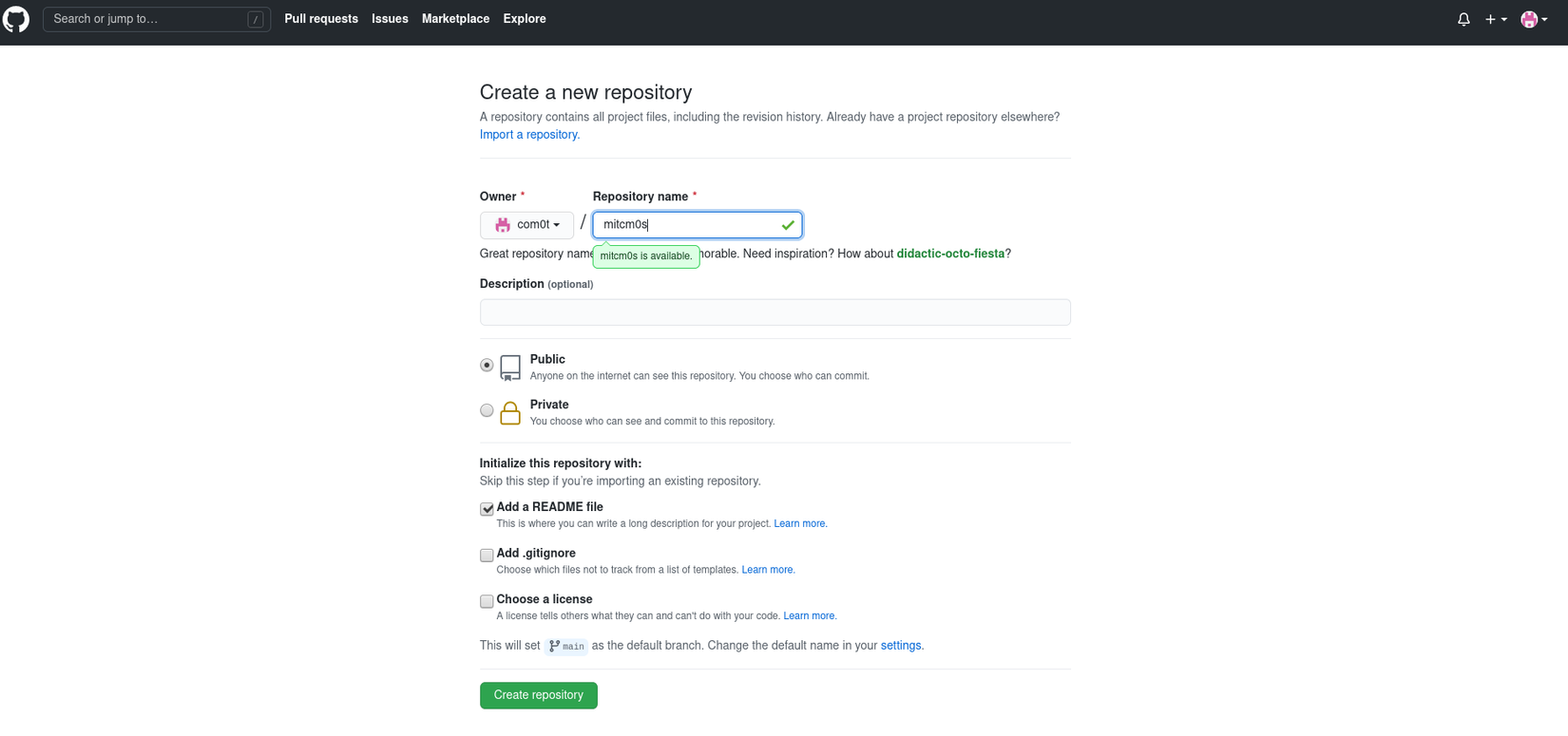 Đầu tiên mình tạo một repo với tên bất kỳ. Trong demo mình tạo tên repo là mitcm0s.
