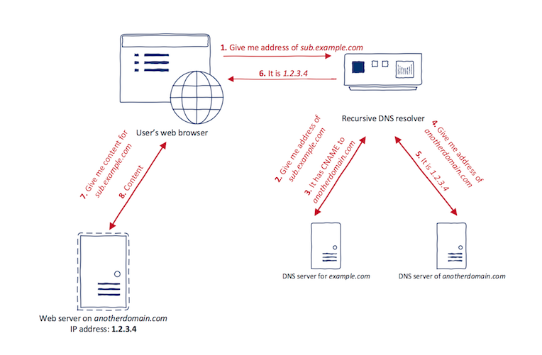 Như trên hình khi ta truy cập vào sub.example.com thì sẽ được máy chủ phân giải tên miền ra anotherdomain.com. Để rõ hơn ta sẽ nhìn vào hình dưới để thấy được quá trình phân giải tên miền khi sử dụng CNAME.