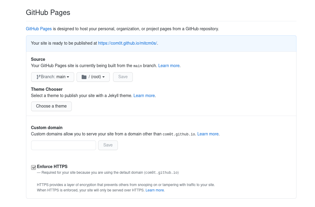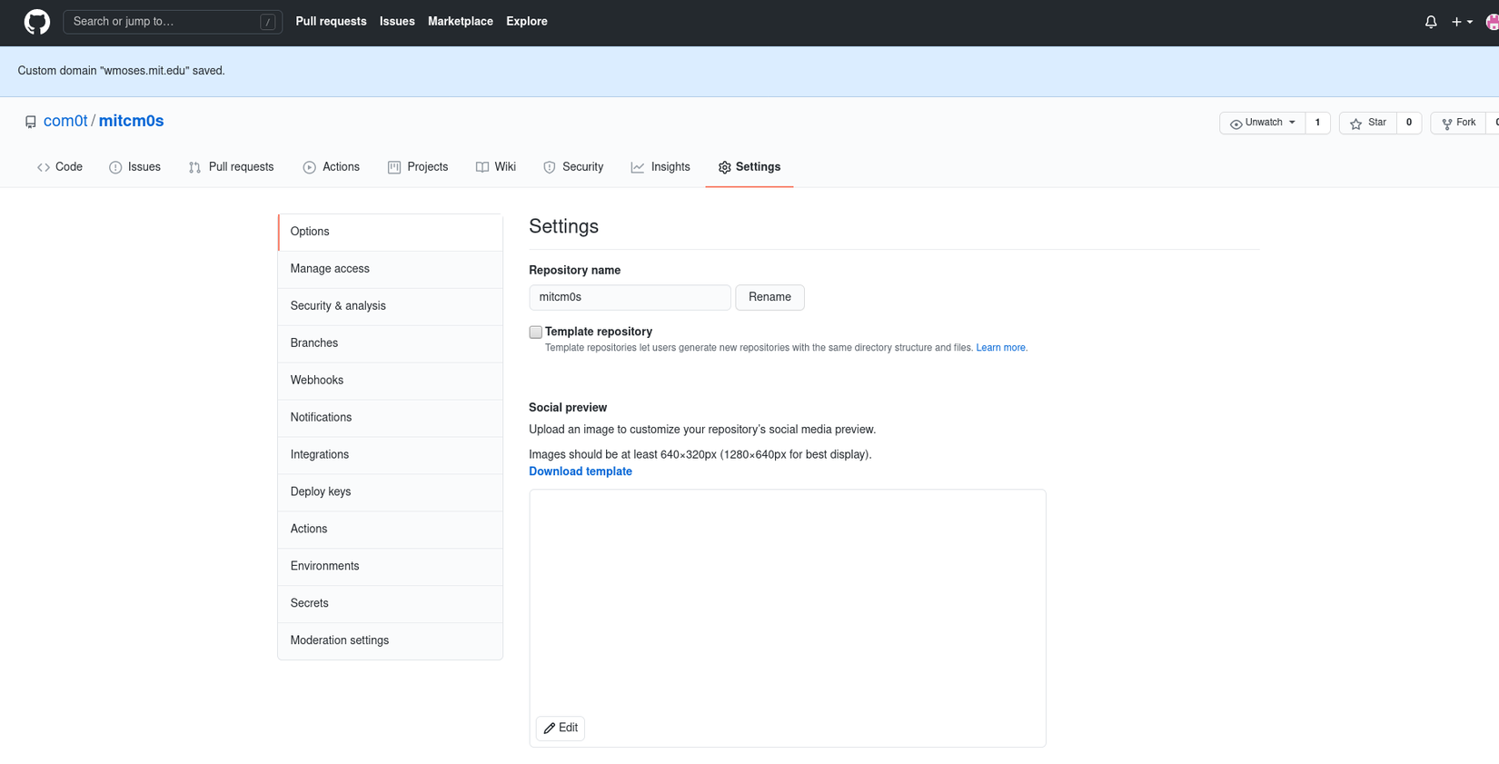 Sau khi lưu lại sẽ có phần Custom domain hiện ra. mình điền domain wmoses.mit.edu và chọn save. Nếu thành công sẽ có thông báo màu xanh hy vọng như hình dưới.