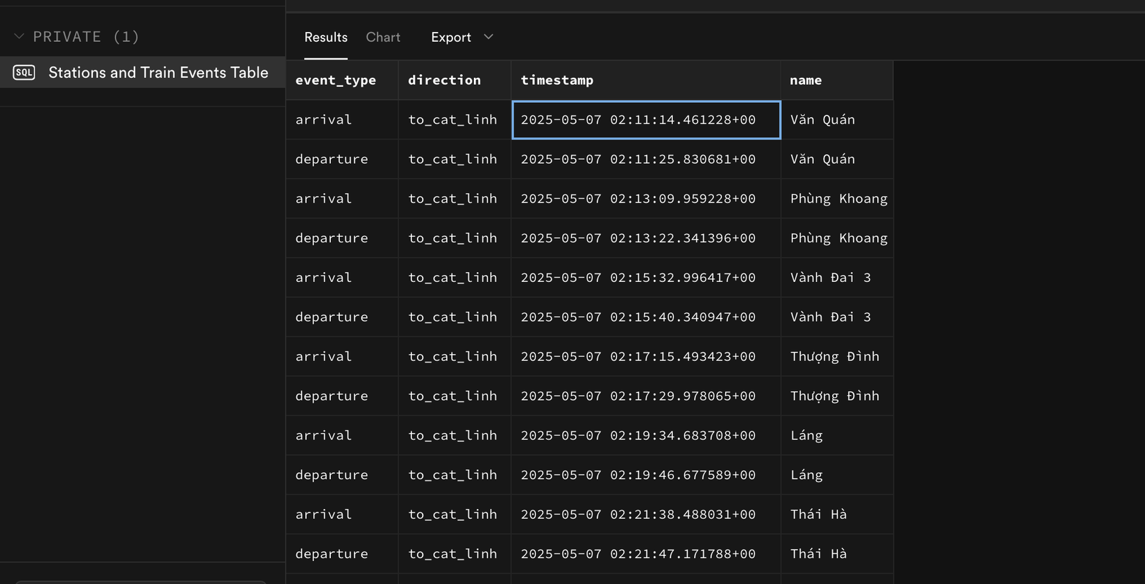 Do không có API công khai hay lịch trình chi tiết, tôi bắt đầu bằng cách tự thu thập dữ liệu. Trong 3 ngày liên tiếp, tôi ghi lại thời gian tàu đến tại các ga trên tuyến đường đi làm của mình để tạo dữ liệu mẫu. Đây là nền tảng để AI phân tích và xây dựng lịch trình đầy đủ cho tuyến tàu trong suốt thời gian hoạt động.