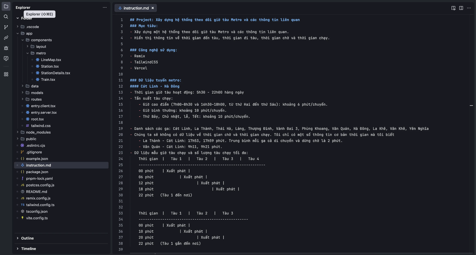 Dựa trên dữ liệu từ các hệ thống metro quốc tế, AI tự động cung cấp thông tin hữu ích như địa chỉ, tiện ích và các tuyến xe buýt liên kết. Khác với nhiều quốc gia, nhu cầu về chỗ gửi xe máy tại các ga metro ở Việt Nam là rất lớn. Vì vậy, tôi đã bổ sung thông tin này vào ứng dụng như một tiện ích không thể thiếu. Sau nhiều lần tinh chỉnh prompt, tôi tối ưu hóa giao diện và đồng bộ lịch trình tàu.