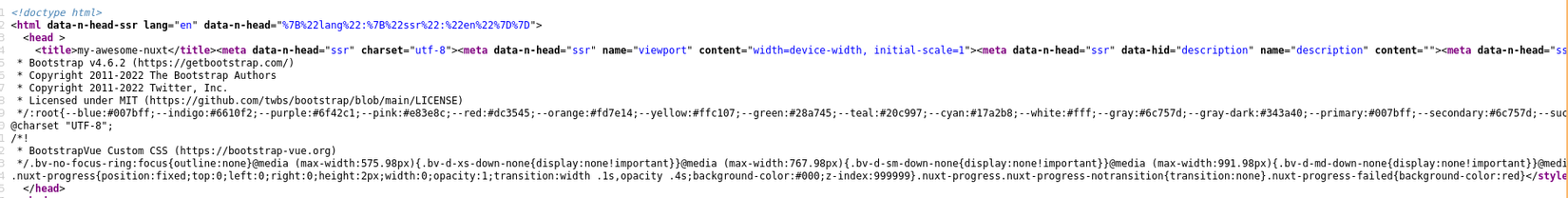 CSS của project được nhúng thẳng vô HTML trang chủ luôn các bạn ạ. Tất nhiên là có nhiều lý do để NuxtJS làm điều này mặc định, tuy nhiên với những project mà mình hay anh em thường gặp thì việc sử dụng 1 thư viện CSS (như mình đang dùng Bootstrap) là cực kỳ phổ biến. Do đó khi NuxtJS nhét hết CSS của page vào header như trên thì cái trang HTML của chúng ta sẽ RẤT RẤT NẶNG.