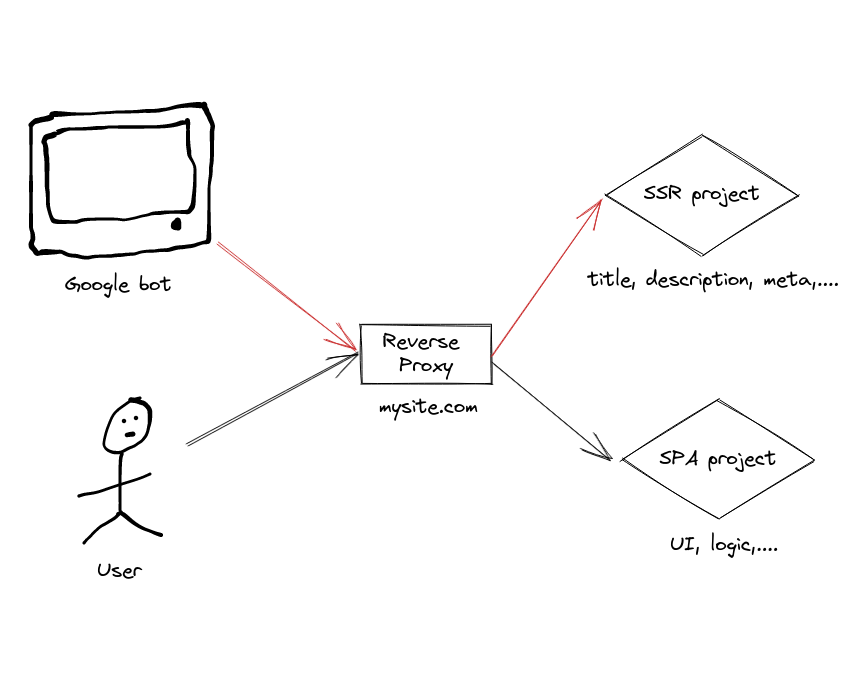 Đến đây là hòm hòm rồi, còn 1 bước quan trọng nhất chính là chia tải làm sao để User sẽ vào trang CSR, Crawler bot sẽ vào trang SSR. Lúc này mình sẽ cấu hình chiếc nginx proxy ở phía trước như sau: