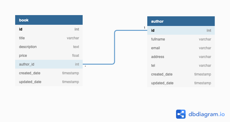 Đầu tiên mình sẽ sử dụng Postgresql để tạo ra 2 bảng là book và author. Vì nhiều quyển sách có thể có chung một tác giả nên mình sẽ thiết kế cơ sở dữ liệu theo cấu trúc như sau: