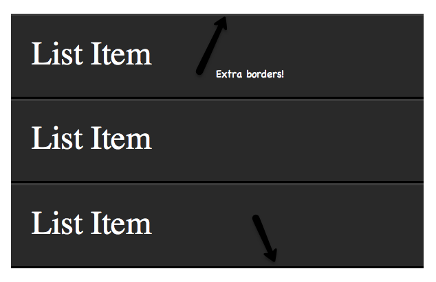 Vấn đề duy nhất, như thể hiện trong hình trên, là một border sẽ không được áp dụng cho phần trên và dưới cùng của danh sách không có thứ tự - trông nó hơi khác. Hãy sử dụng các lớp giả :first-child và :last-child để khắc phục điều này.