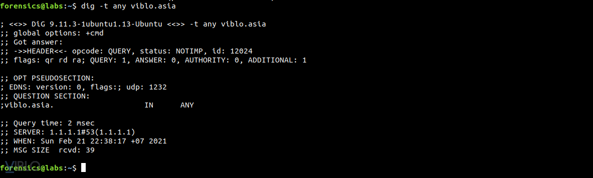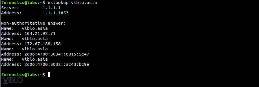 Lệnh sau thực hiện tra cứu DNS trên tên miền ‘viblo.asia’.