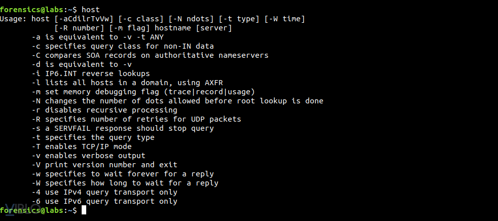 Khi gõ lệnh ‘host’ trong terminal, chúng ta sẽ nhận được danh sách các tùy chọn hỗ trợ sử dụng ứng dụng:
