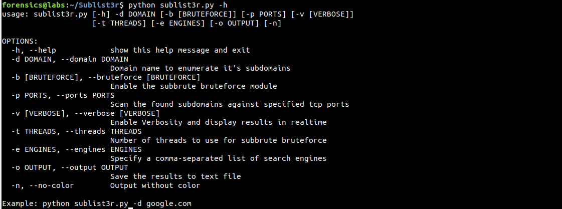 Để xem hướng dẫn sử dụng Sublist3, ta sử dụng câu lệnh sau: