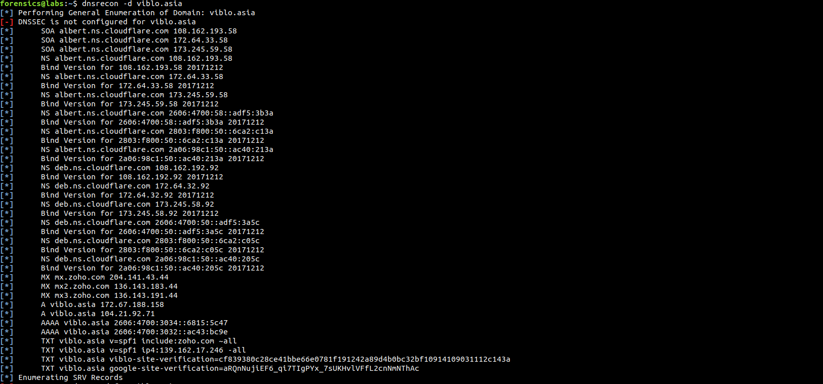 Ảnh chụp màn hình sau cho thấy kết quả tìm kiếm của DNSenum với viblo.asia:
