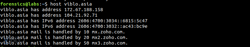 Host là một công cụ đơn giản khác để thực hiện việc tra cứu DNS. Nó có thể được sử dụng để chuyển đổi domain thành địa chỉ IP và ngược lại.