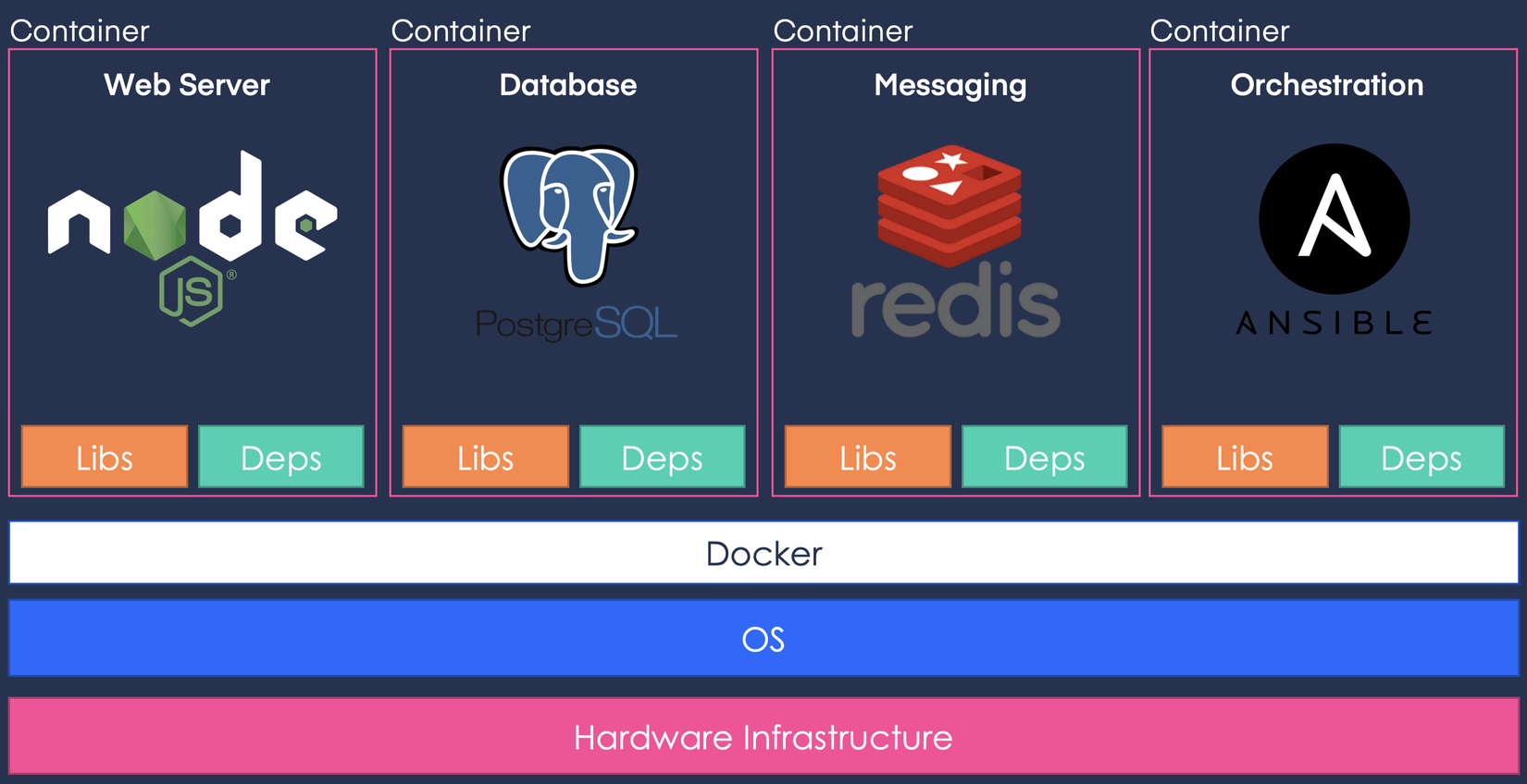 Docker nó sẽ gom những cái như là NodeJS, PostgreSQL, Redis, Ansible, cài nó khá là phức tạp và làm sao để nó đúng version thì Docker nó gom những cái này lại thành 1 cái container.