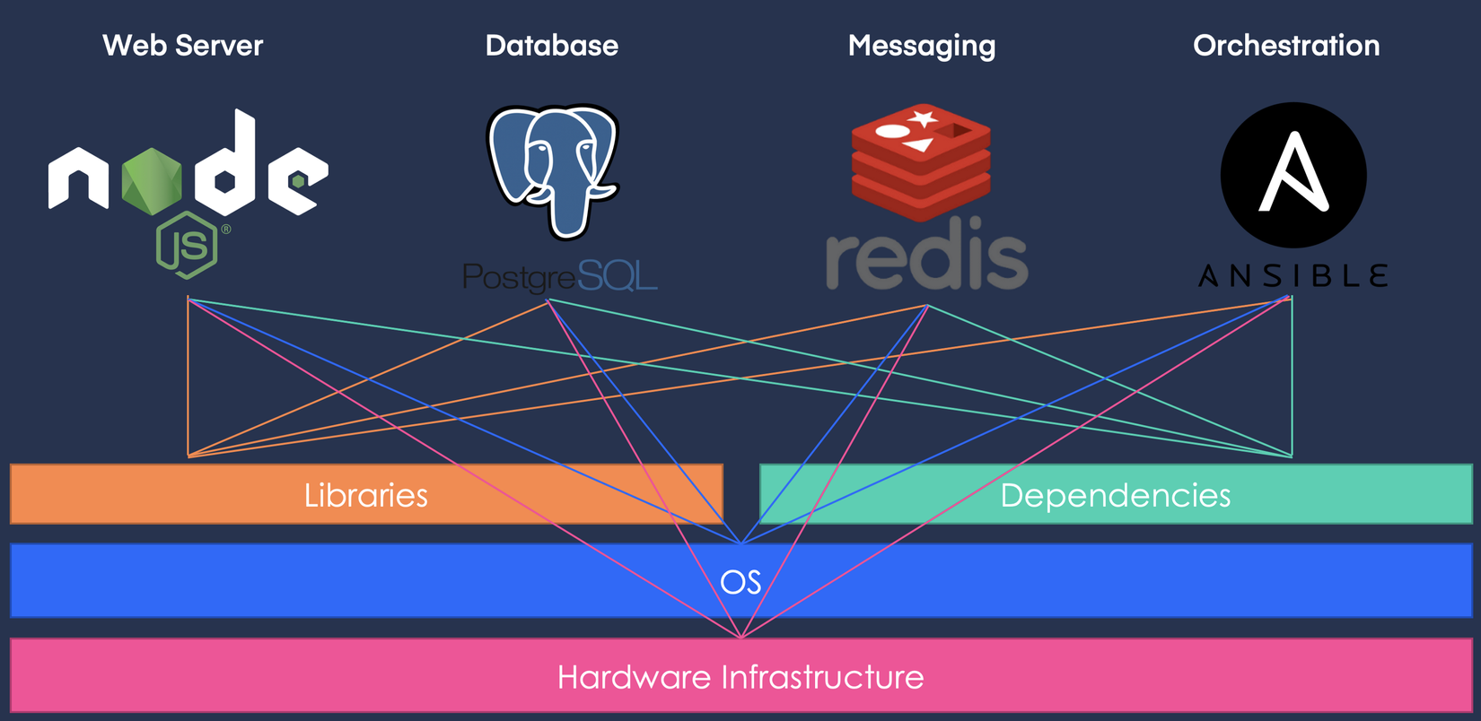 Hãy tưởng tượng bạn code 1 cái ứng dụng, có 1 cái web server được viết bằng NodeJs, có database là PostgreSQL, sử dụng Redis để lưu trữ message,... Mỗi cái như này các bạn phải cài rất là nhiều thư viện, dependencies, đi kèm theo đó là những cái config.. Và khi các bạn code xong, muốn cho người dùng sử dụng thì các bạn phải deploy nó.