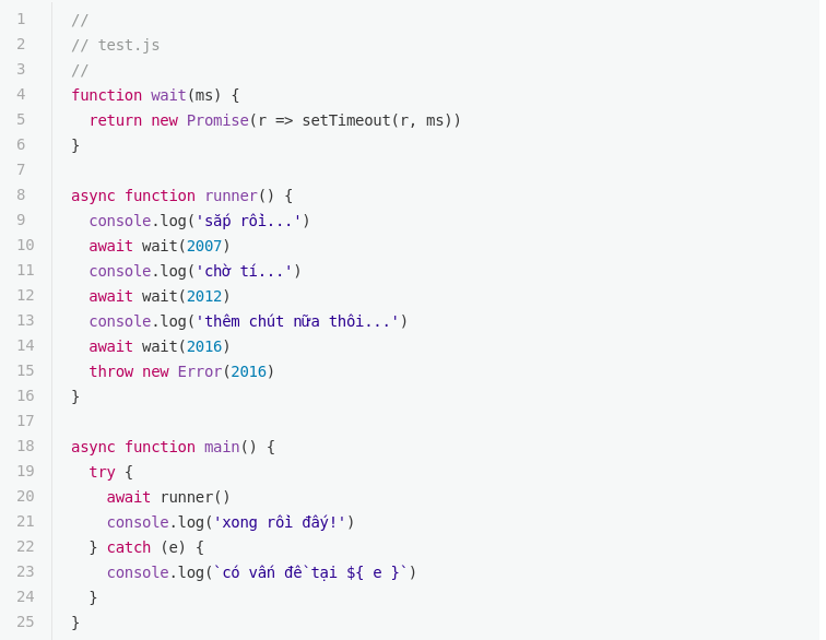 Với từ khóa async này, ta có thể đợi các Promise (thao tác bất đồng bộ) xử lý trong hàm đó mà không tạm dùng luồng chính bằng từ khóa await như ví dụ trên.