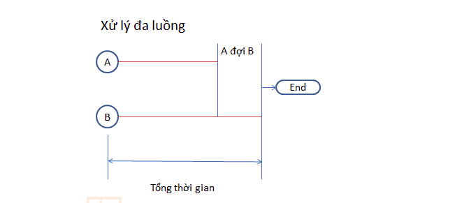 Đồng bộ: Hiểu đơn giản thì đồng bộ có nghĩa là thực hiện các công việc một cách tuần tự, công việc này xong thì mới được thực hiện các công việc khác. Ví dụ có 2 công việc A và B thì khi có nghĩa là A thực hiện xong trước rồi mới tới lượt B. Như vậy tổng thời gian hoàn thành sẽ như bên dưới.