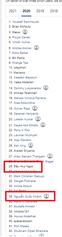 Cùng nhau điểm danh những gương mặt được Facebook vinh danh trên bảng xếp hạng năm 2020 những hacker Việt Nam đã có đóng góp các lỗ hổng bảo mật cho Facebook nhé. Bảng vinh danh được cập nhật tại đây https://www.facebook.com/whitehat/thanks