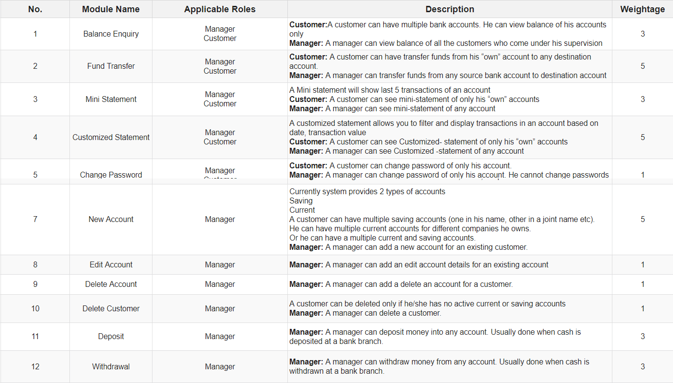 Quay trở lại với case study Guru99 Bank. Website này được chia thành 12 function cùng với độ phức tạp như sau: