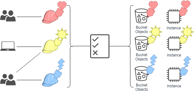 - ABAC phân quyền dưa trên thuộc tính theo đó các chính sách định nghĩa phân quyền dựa trên thuộc tính của tài nguyên và của người sử dụng. Từ đó đạt được sự linh hoạt và kiểm soát dễ dàng các phân quyền. Trong IAM ABAC được sử dụng dựa trên các tag được gắn với các resource và Identity để dễ dàng phân quyền theo nhóm các tài nguyên và nhóm định danh.