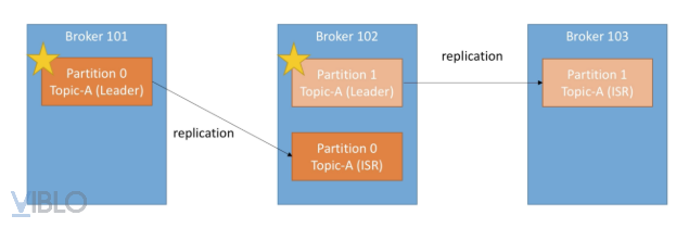 Tại bất kỳ thời điểm nào thì chỉ có một broker làm leader các partition còn lại. Và chỉ có leader partition mới nhận và xử lý data. Giả sử như broker 101 sập. in-sync replica ở broker 102 sẽ thay thế làm leader. Tiếp tục xử lý data. Khi broker 101 được khởi động lại nó lại làm replica, đồng bộ dữ liệu với leader hiện tại ở 102. Cho đến khi trở thành lại làm leader. Việc làm leader sẽ phụ thuộc vào Zookepper quyết định.