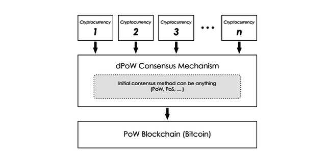 Blockchain dựa trên dPoW có thể sử dụng Proof of Work (PoW) hoặc Proof of Stake (PoS) để hoạt động hay nó có thể tự gắn vào bất kỳ blockchain chạy PoW nào mong muốn. Mà hashrate của Bitcoin hiện tại là cao nhất trong các blockchain sử dụng PoW . Hình minh họa dưới đây cho thấy mối quan hệ giữa các blockchain trong dPoW :