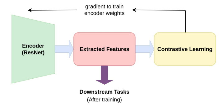 Sau khi data đi qua khối encoder thì sẽ được tính toán với projection head được cấu thành từ các fully-connected layer để cho ra output là 1 embedding vector biểu diễn cho ảnh ở đầu vào. Mạng này có tác dụng khuếch đại các đặc trưng bất biến của dữ liệu từ đó tối đa hóa khả năng phân biệt các phép biến đổi từ cùng 1 bức ảnh của mạng.