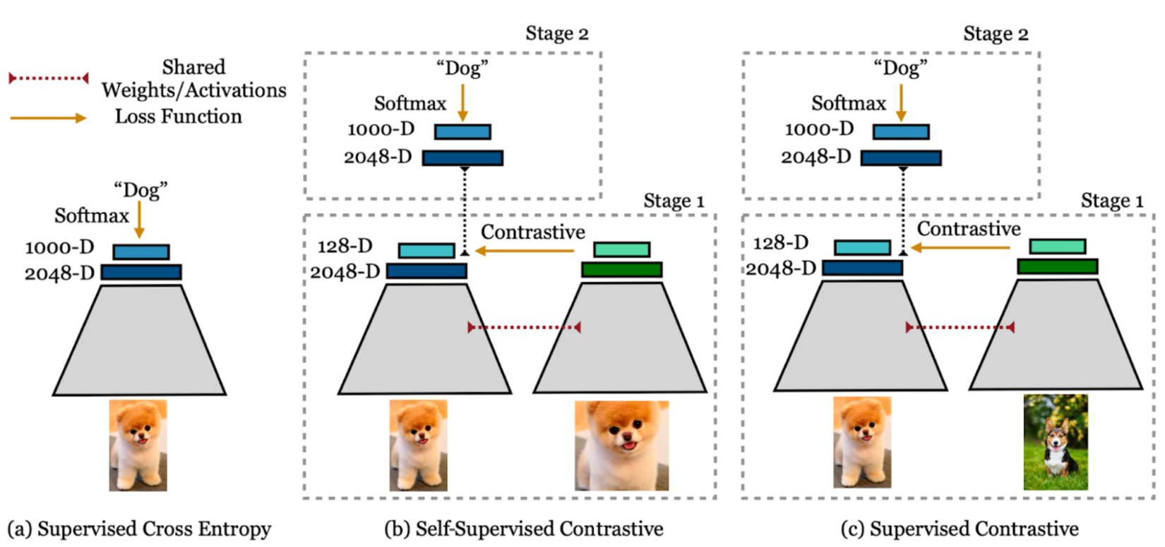 Trong paper “ Supervised Contrastive Learning” được trình bày tại NeurIPS 2020, các nhà nghiên cứu đã đề xuất một hàm loss gọi là SupCon - Supervised Contrastive Loss, nhằm thu hẹp khoảng cách vô hình giữa self-supervised learning và fully-supervised learning và cho phép contrastive learning có thể được ứng dụng với các bài toán supervised learning. Vẫn giữ nguyên ý tưởng của contrastive learning, hàm SupCon sẽ cố gắng tận dụng dữ liệu được gán nhãn để kéo các embedding vector đã được chuẩn hóa của cùng 1 class lại gần nhau và ngược lại đối với những embedding vector khác class. Việc có thêm dữ liệu được gán nhãn sẽ làm đơn giản hóa quá trình chọn positive sample và tránh được các trường hợp false negative