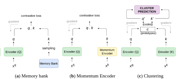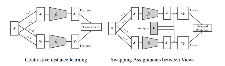 Hai kiến trúc kể trên đều tập trung vào hướng so sánh các sample sử dụng similarity metric và cố gắng kéo các sample giống nhau lại gần, đẩy các sample khác nhau ra xa. Nhưng kiến trúc ở phần này lại đi ngược với 2 hướng kể trên, người ta đi theo hướng end-to-end với 2 encoders chia sẻ trọng số với nhau, nhưng thay vì đi theo hướng contrastive thì họ sử dụng thuật toán phân cụm để nhóm các đặc trưng giống nhau lại. Mục đích của việc này không chỉ là để kéo 1 cặp sample lại với nhau mà còn đảm bảo được việc tất cả các sample tương tự với nhau được phân vào 1 cụm với nhau. Ví dụ trong không gian embedding của 1 tập đa dạng các loại ảnh, các đặc trưng của mèo sẽ đuợc kéo lại gần với của chó (cùng là con vật) và đẩy ra xa với của nhà. Một trong những nghiên cứu được đề xuất gần đây ứng dụng phương pháp phân cụm nói trên chính là SwAV: