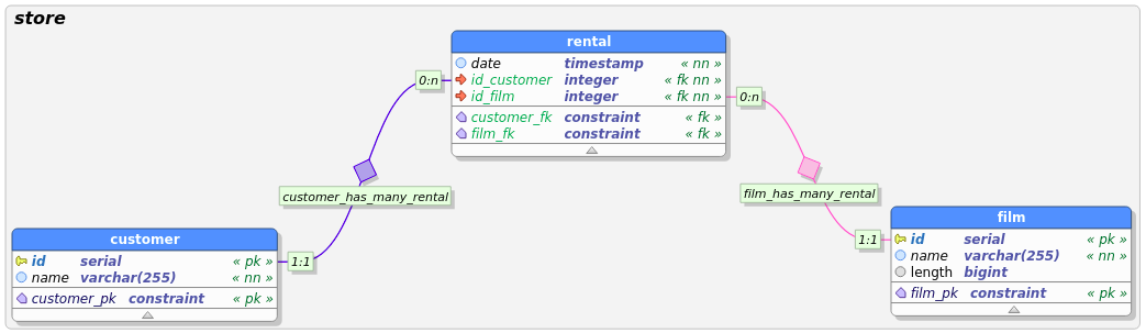 Khi đã cài đặt thành công PgModeler, tiến hành thiết kết ERD trong PgModeler để thiết lập mối quan hệ giữa các bảng. Ví dụ ở đây là các bảng customer, film, rental.