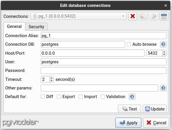 Như đã đề cập từ trước một trong những tính năng của PgModeler là liên kết đến hệ cơ sở dữ liệu PostgresSq.. Để liên kết đến hệ cơ sở dữ liệu SQL, chỉ cần cấu hình kết nối với các thông tin như hình