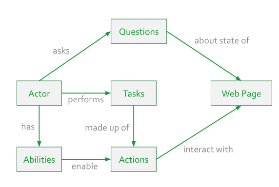 Actors perform tasks: actor cần thực hiện một số các task để hoàn thành được mục tiêu. Ví dụ như: adding a todo item, sử dụng một số method.