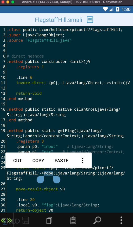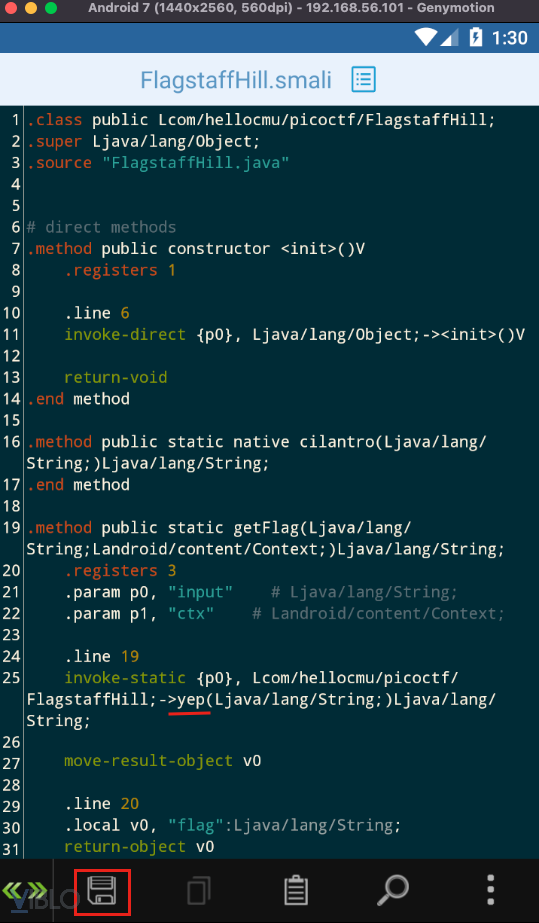 Cụ thể là đổi mã nguồn sao cho khi sự kiện nhấn nút xảy ra sẽ gọi làm yep() thay vì gọi làm nope(). Tệp tin cần chỉnh sửa là FlagstaffHill.smali