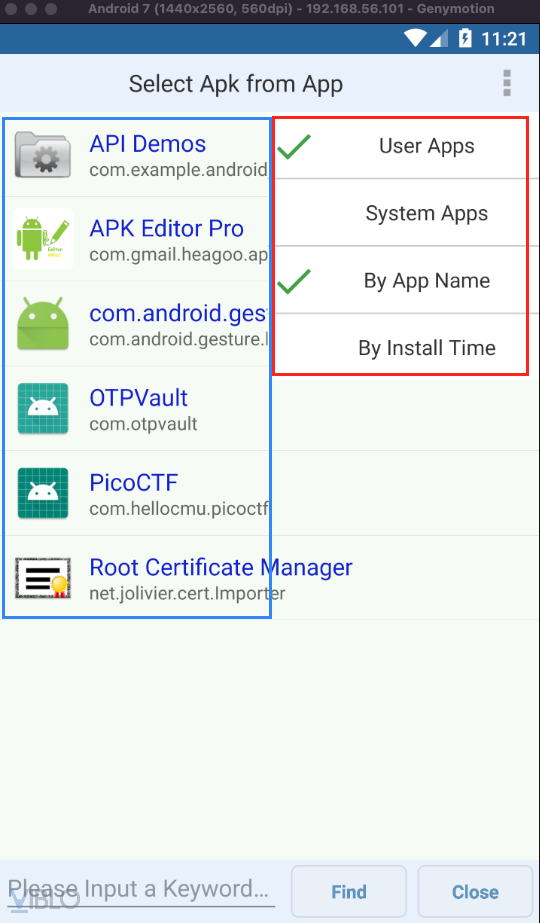 - Lựa chọn tệp tin APK từ ứng dụng cài trên thiết bị: ứng dụng cài đặt từ CHplay sẽ được lưu lại trong thư mục cố định trên thiết bị, công cụ sẽ tìm và mở tệp tin APK tại đây.