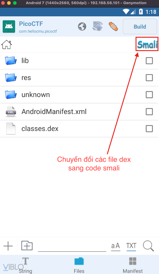 Đặc biệt, ở trong tab "Files", khi click vào nút "Smali" thì APK Editor Pro sẽ chuyển đổi các tệp tin Dex thành mã nguồn Smali để chúng ta tiến hành chỉnh sửa.