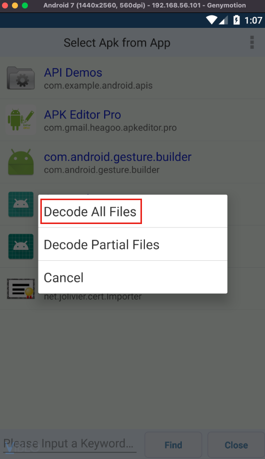 Đây là chế độ hoàn chỉnh nhất, cho phép tác động sâu nhất vào hoạt động của ứng dụng. Với chế độ này chúng ta có thể dịch ngược tệp tin DEX sang các tệp mã Smali. Sau khi chọn chế độ chỉnh sửa toàn bộ thì chúng ta sẽ chọn Giải mã toàn bộ tệp tin để tiện cho việc chỉnh sửa mã nguồn ứng dụng.